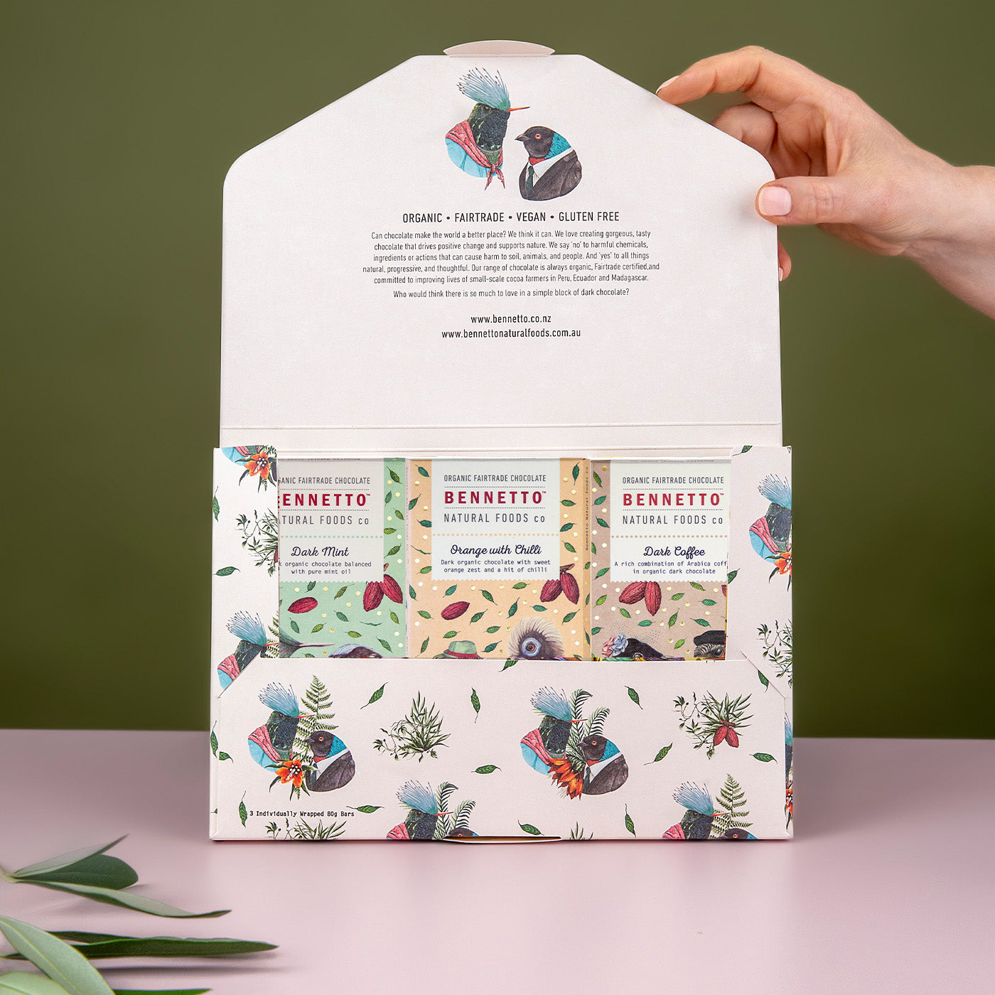 Pack includes 6x 80g bars of chocolate nestled in a gorgeous envelope that can be used for gifting.