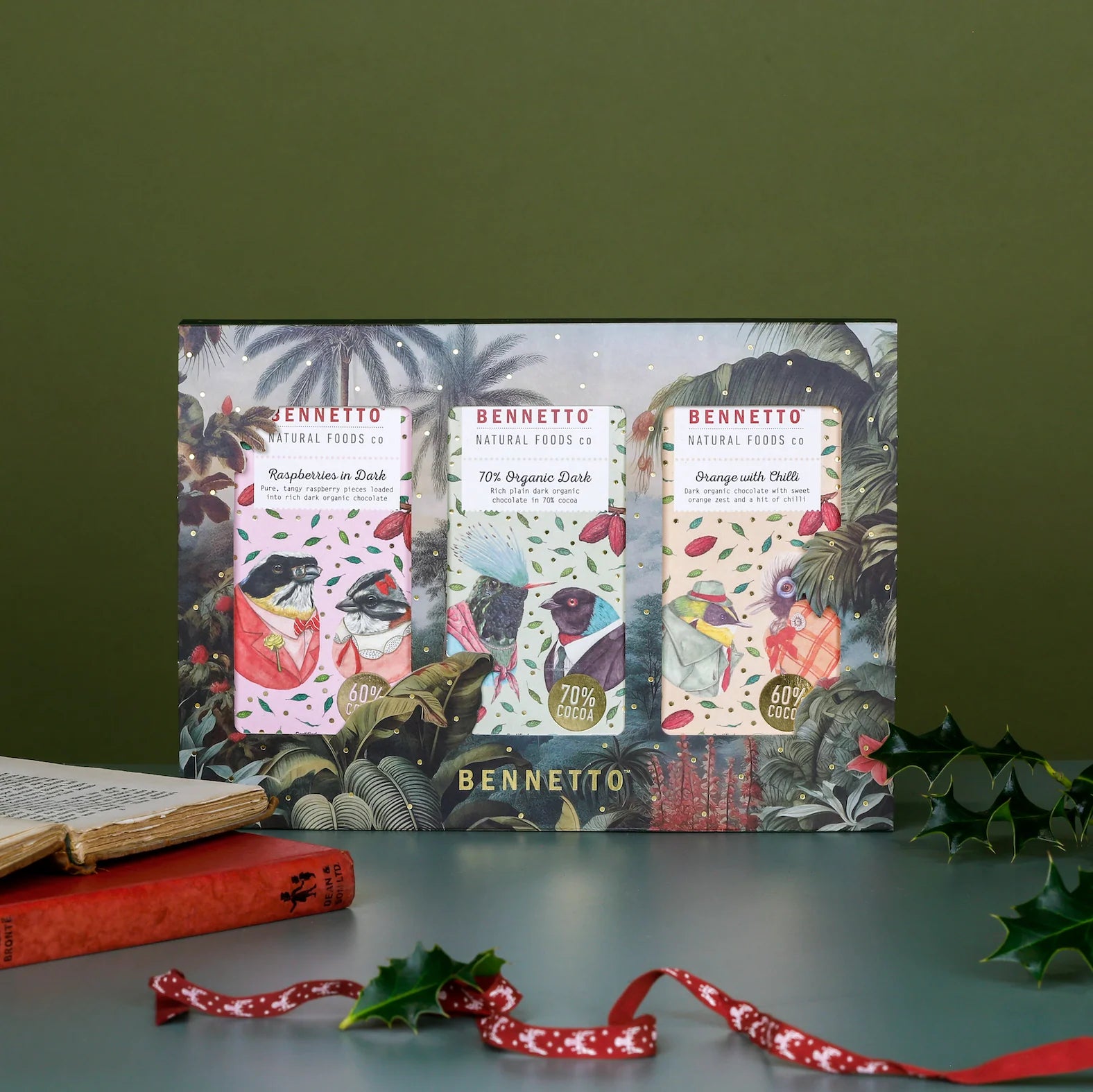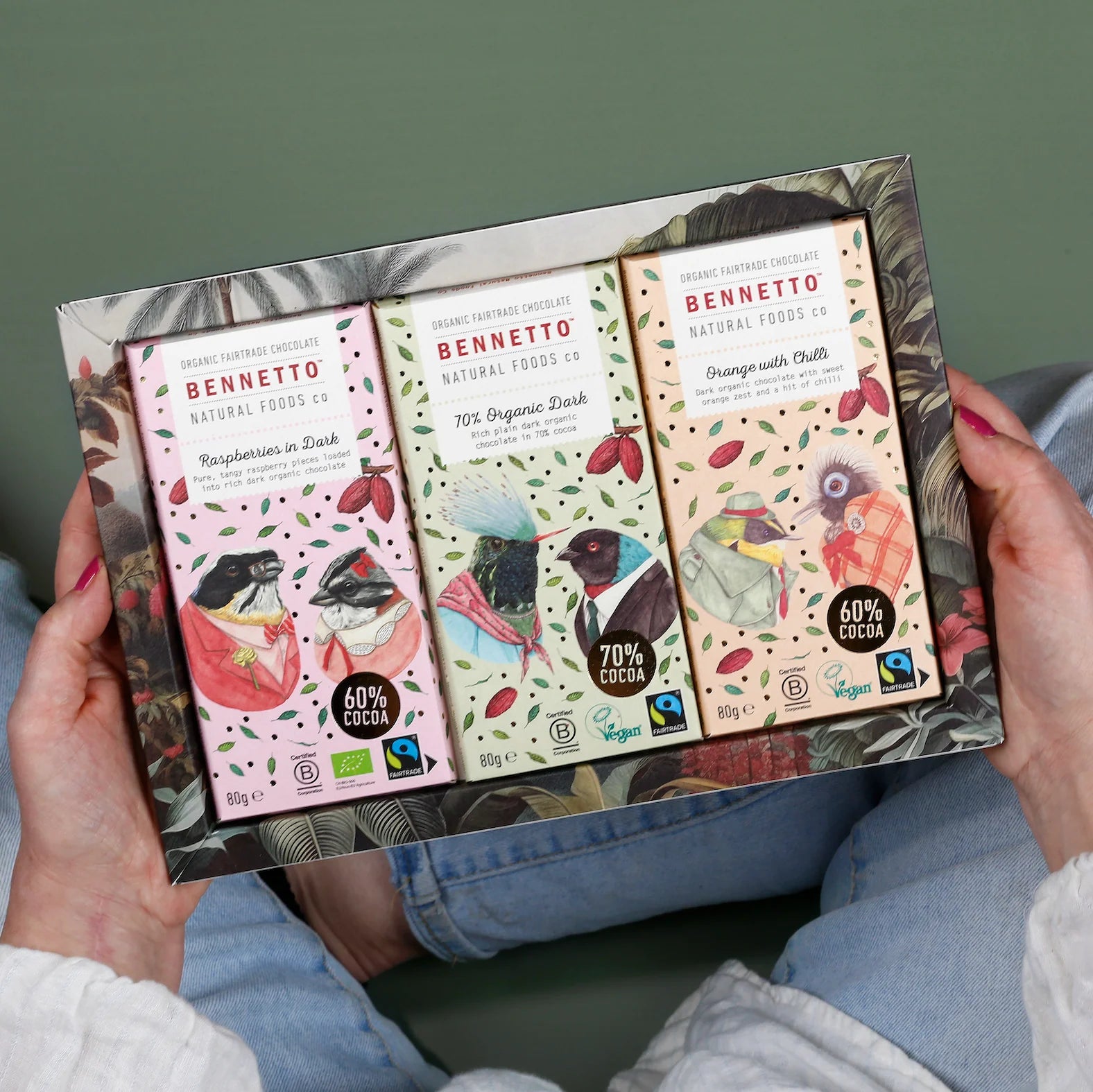 Step into the jungle with our brand-new gift box, designed to delight both the eyes and the taste buds. This premium collection showcases three of our most-loved 80g organic dark chocolate bars, wrapped in stunning illustrated packaging that celebrates Bennetto’s birds and where they come from.